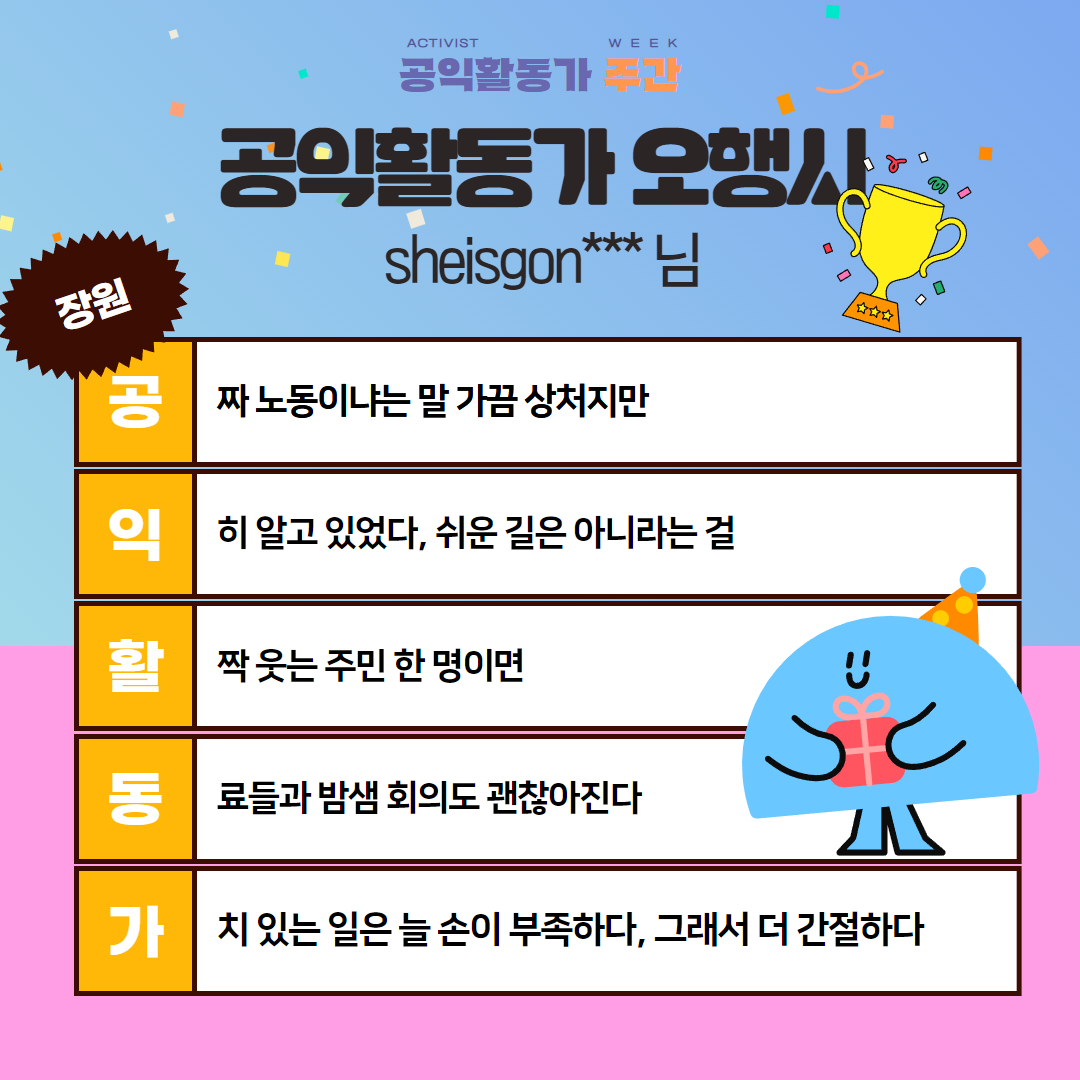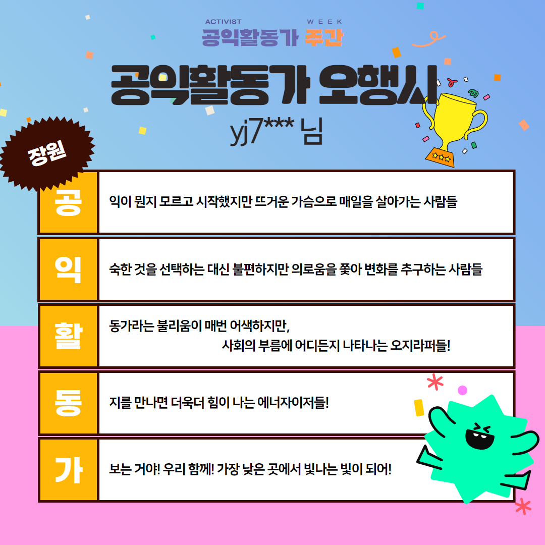 2025 공익활동가주간 오행시 이벤트의 장원, 3편의 오행시를 소개합니다!